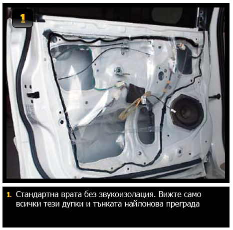 Автомобилна врата без звукоизолацияОригиналните тонколони и оригиналната озвучителна техника в колата имат достатъчно мощност да породят вибрации във вратите, които причиняват досадно дрънкане и неприятни шумове. Това, за което повечето хора не знаят е голямата загуба на мощност на тонколоните монтирани във врати. Тънките нетретирани ламарини на стандартните автомобилни врати ги правят несолидни. При движението на говорителя, вибрациите предавани на ламарините на вратата са загубена акустична мощност. Друг проблем е, че външната обвивка на вратата е твърде близо до задната част на говорителя. Отражението и ехото създавано от задната звукова вълна води до изкривяване и влошаване акустичните качества на говорителя. Не ми ли вярвате? Пробвайте да вземете парче алуминиево фолио и поставяйки го близо до устата си да говорите. Усетихте ли разликата? Не само, че чувате вибрирането на фолиото, но и чувате как се променя гласа ви. Резултата не е добър. А при вратата има и технически отвори. С толкова много дупки във вътрешната преграда на вратата не може да очаквате плътен мид-бас звук.
