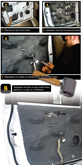 В допълнение на другите две стъпки, добавете слой акустична пяна директно на външната стена точно зад говорителя. Това понижава шума и изкривяването причинявано от задната звукова вълна и значително подобрява звуковите качества на говорителя. Сега може да сте сигурни, че сте елиминирали кухия звук създаван от задната звукова вълна. Добавянето на акустична пяна върху вътрешната обвивка на вратата елиминира подскачащите (рефлектиращи) звукови вълни в пространството между вътрешната обвивка и кората на вратата. Имайте предвид, че акустична пяна се продава с различни дебелини, които трябва да съобразите с възможностите за монтаж във вашите врати. Монтажа на пяна върху вътрешната обвивка, не позволява допирането на кората до вратата и по този начин спира неприятното дрънкане.