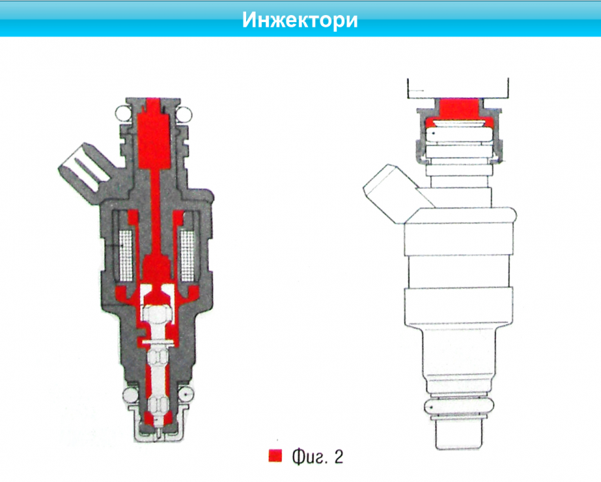 21 пропуска добавъчен въздух след дроселовата клапа, а чрез винта 22 се регулира добавъчният въздух за празен ход. Сензорът 23 следи за положението на коляновия вал спрямо ГМТ, а сензорът 24 - честотата на въртене на вала. Цялата система се захранва с електрически ток от акумулатора 25, към който са свързани контактният ключ 29 и релетата 27 и 28. Всички сензори изпращат сигналите си в процесора 5, който ги обработва в реално време и според програмата, заложена в паметта му, определя оптималната порция гориво, която трябва да се впръсне. Тъй като налягането на горивото винаги е постоянно, порцията се определя от продъл-жителността на впръскването. Горивото постъпва в инжектора (фиг. 2) през канала 1, а елект-рическият ток се подава на клемата 2, която захранва с него електромагнита 3 и магнитния резервоар 4, Електромагнитът повдига иглата 5, при което горивото изтича през отвора 6. Пръстенът 7 уплътнява инжектора към цилиндровата глава.